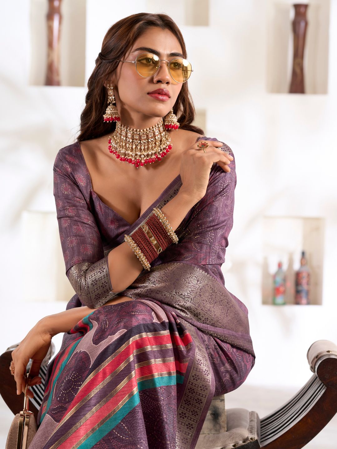 Step into a world of understated luxury with The Dusty Glow. This magnificent saree is crafted from premium Soft Dola Silk, a fabric celebrated for its rich texture, exceptional durability, and sophisticated drape. Featuring contemporary Foil Print artistry in a curated Dusty Color Matching palette, this ensemble is the perfect choice for the modern woman who loves a blend of traditional shine and modern aesthetics.