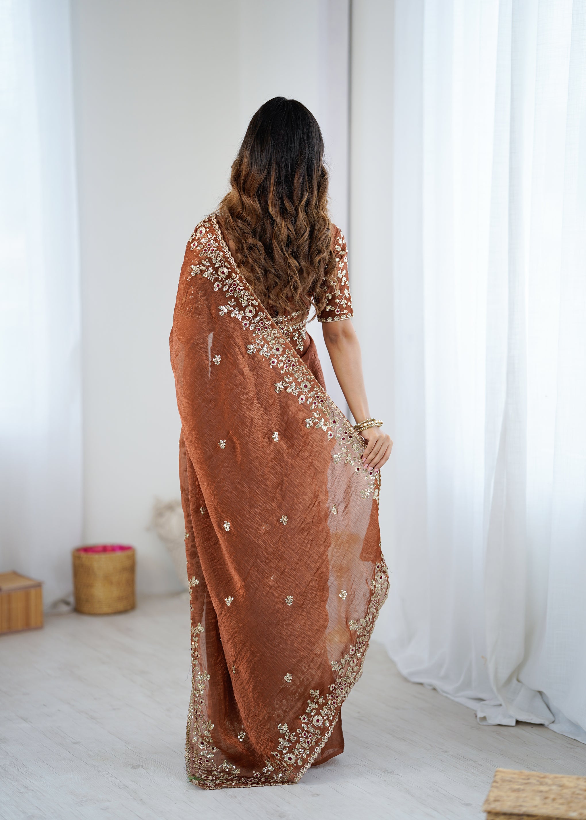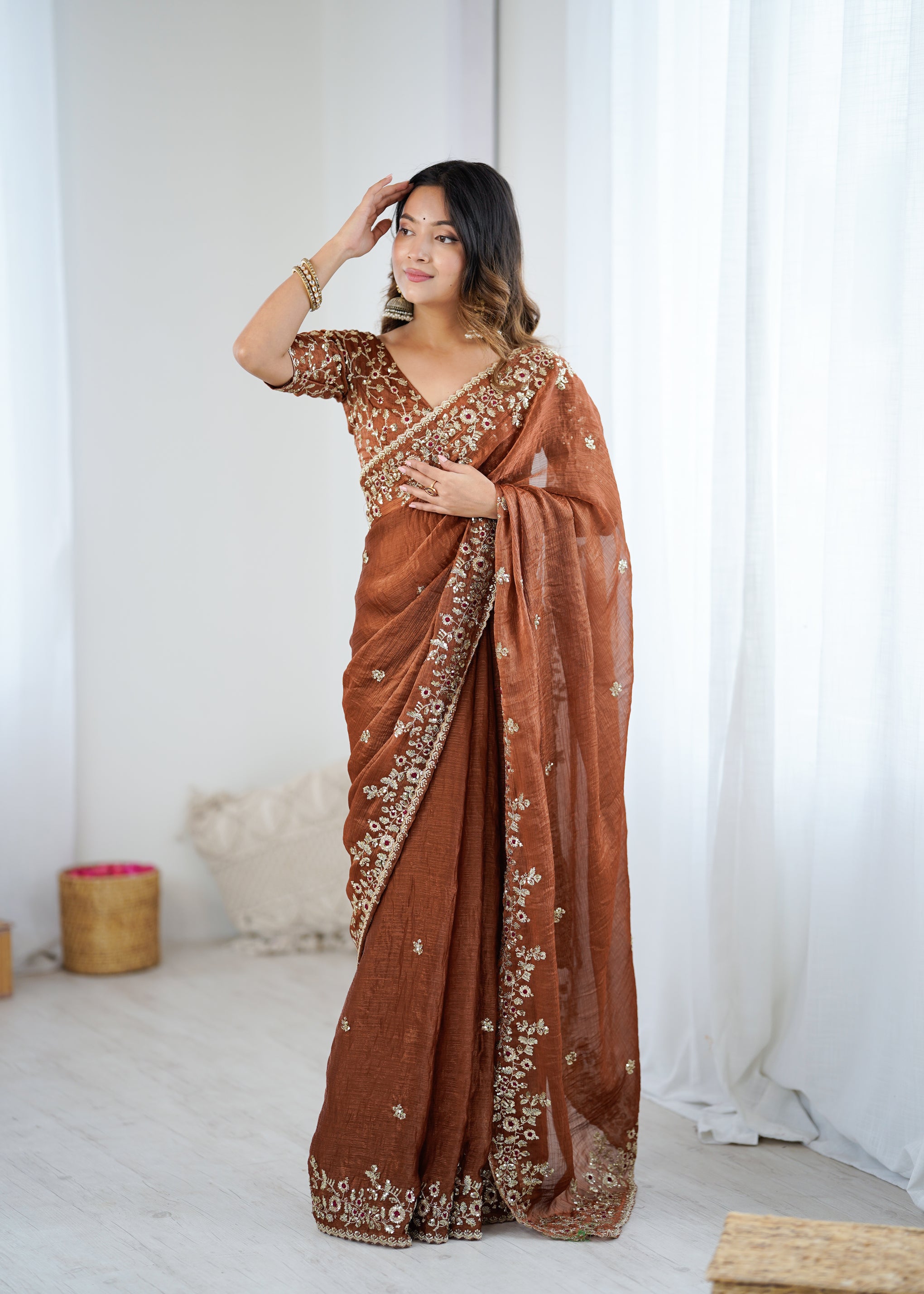 Step into the spotlight with The Fendy Duotone Radiance Saree, a study in flowing elegance and shimmer. Crafted from exquisite FENDY CHIFFON TWO TONE, this fabric shifts subtly in color as you move, creating a stunning visual depth. The saree is lavishly embellished with delicate SEQUINS AND EMBROIDERY WORK, offering a beautiful balance of texture and sparkle. The perfectly matched chiffon blouse ensures a cohesive and unforgettable look.