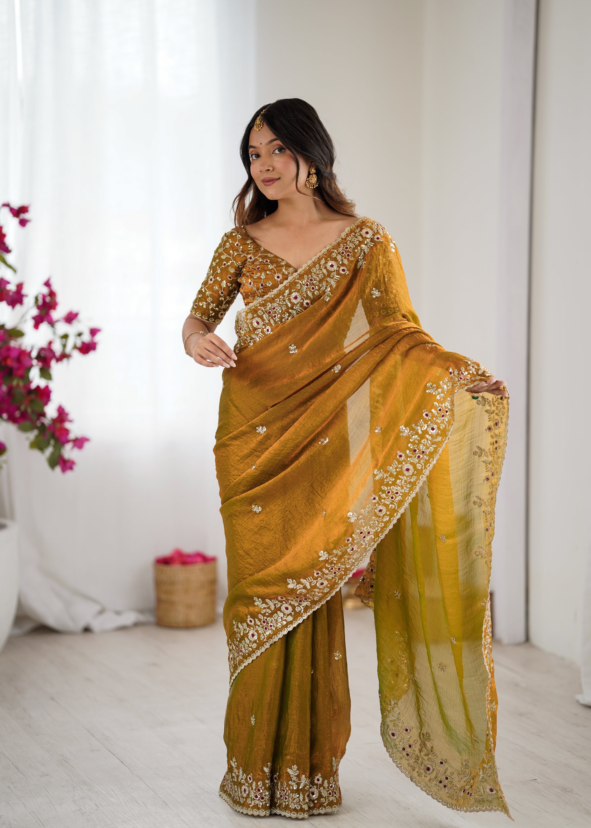 The main body of the saree is made from premium FENDY CHIFFON TWO TONE, renowned for its remarkably soft, fluid drape and luxurious dual-tone color effect. This combination ensures the saree is incredibly lightweight, comfortable, and visually dynamic, shimmering beautifully under light.