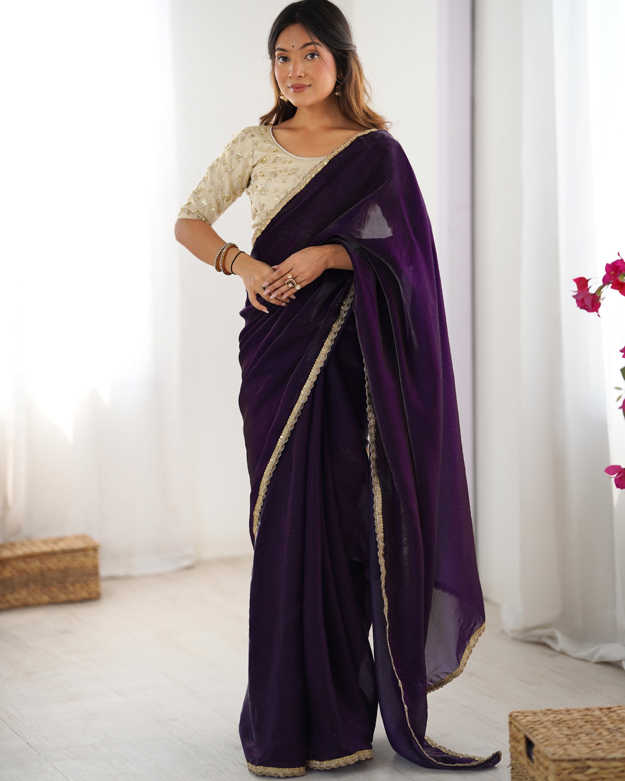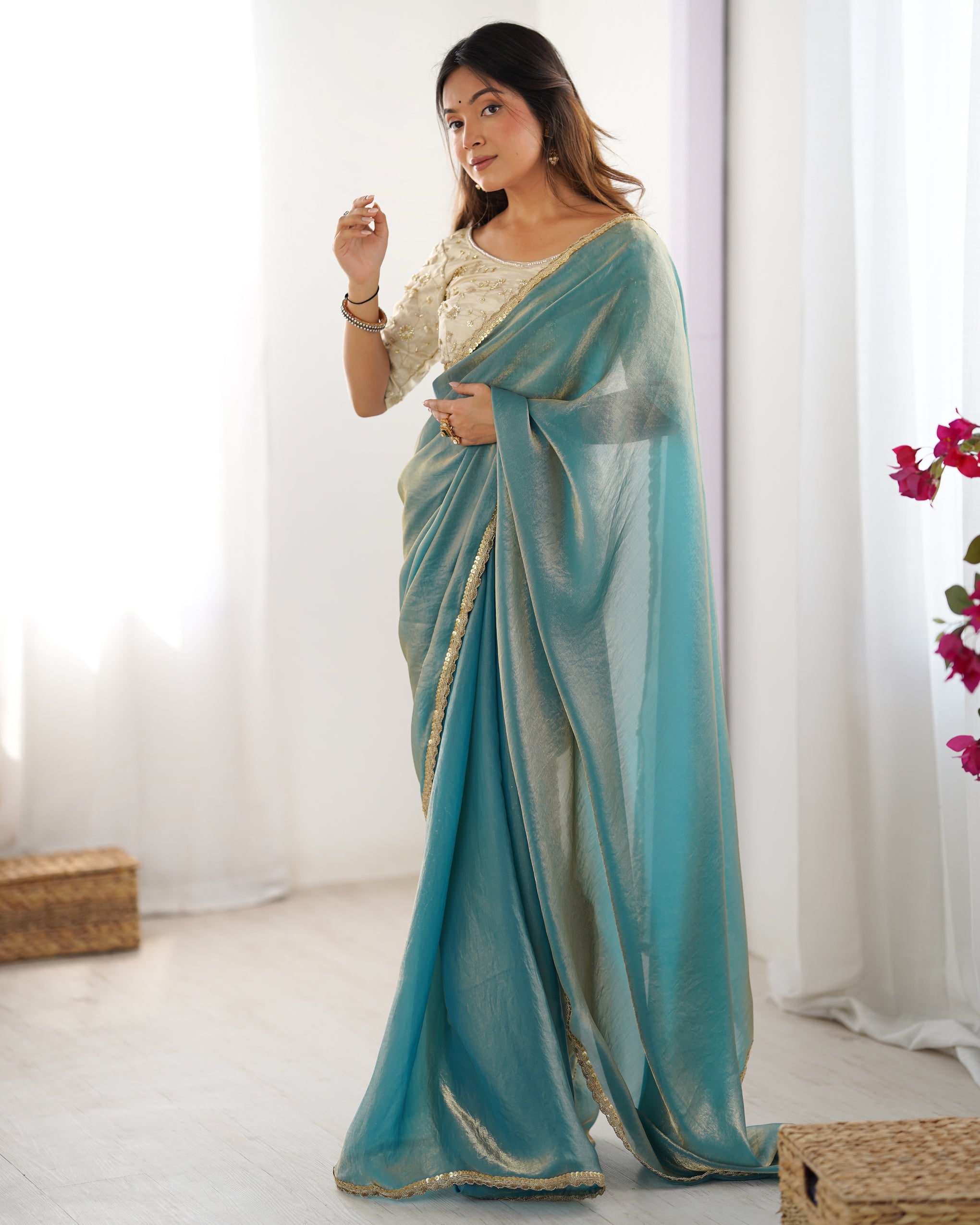 • Contrasting Blouse: Matching unstitched Tissue Silk blouse piece