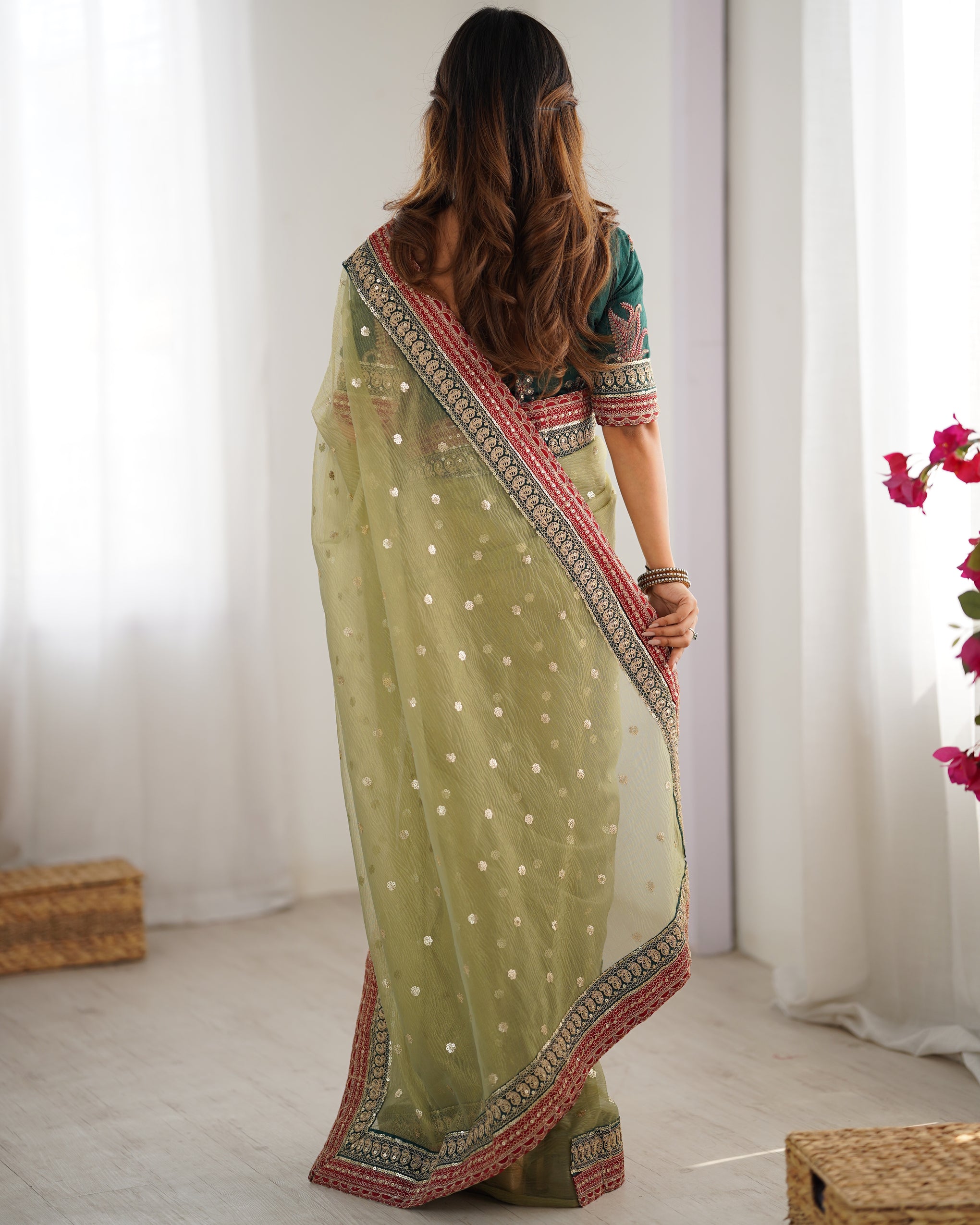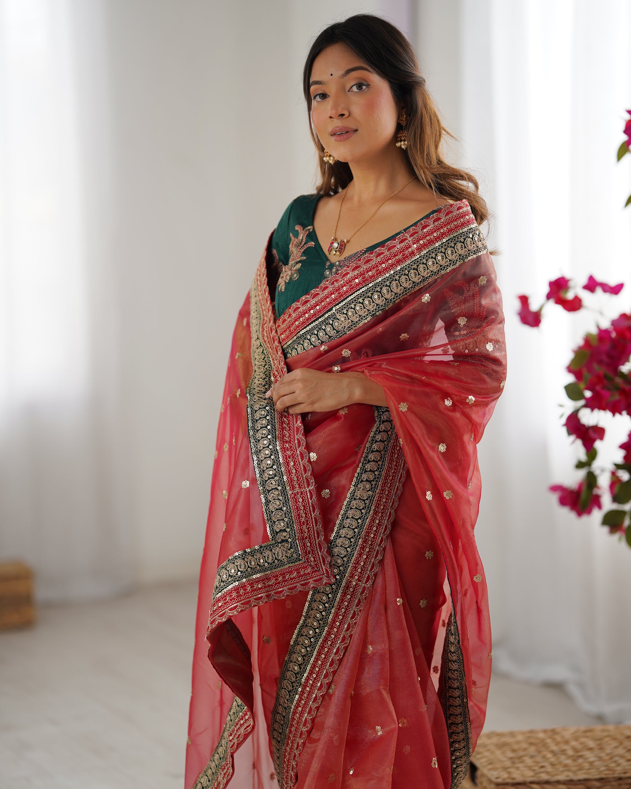 Elevate your festive wardrobe with the sheer brilliance of The Ethereal Grace. This exquisite saree is crafted from premium Organza, a fabric celebrated for its delicate translucency and sophisticated structure. Adorned with a magnificent blend of Sequins and Embroidery Work, this piece is designed for the modern woman who seeks a balance between traditional craftsmanship and contemporary glamour.