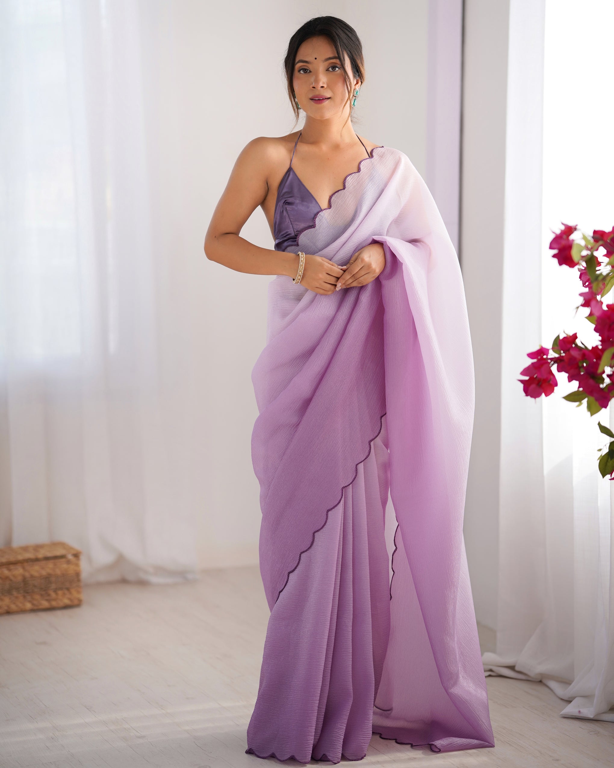 Experience the unique appeal of The Aurora Crush Saree, a piece defined by its intriguing texture and sophisticated detailing. Crafted from the distinctive CRUNCHY PADDING fabric, this saree provides a structured yet comfortable drape. The visual interest is beautifully framed by the elegant ARCO BORDER LACE, which runs along the edges to create a contemporary and polished finish. Paired with a luxurious Ultra Satin blouse, this saree is ideal for making a stylish statement at any event.