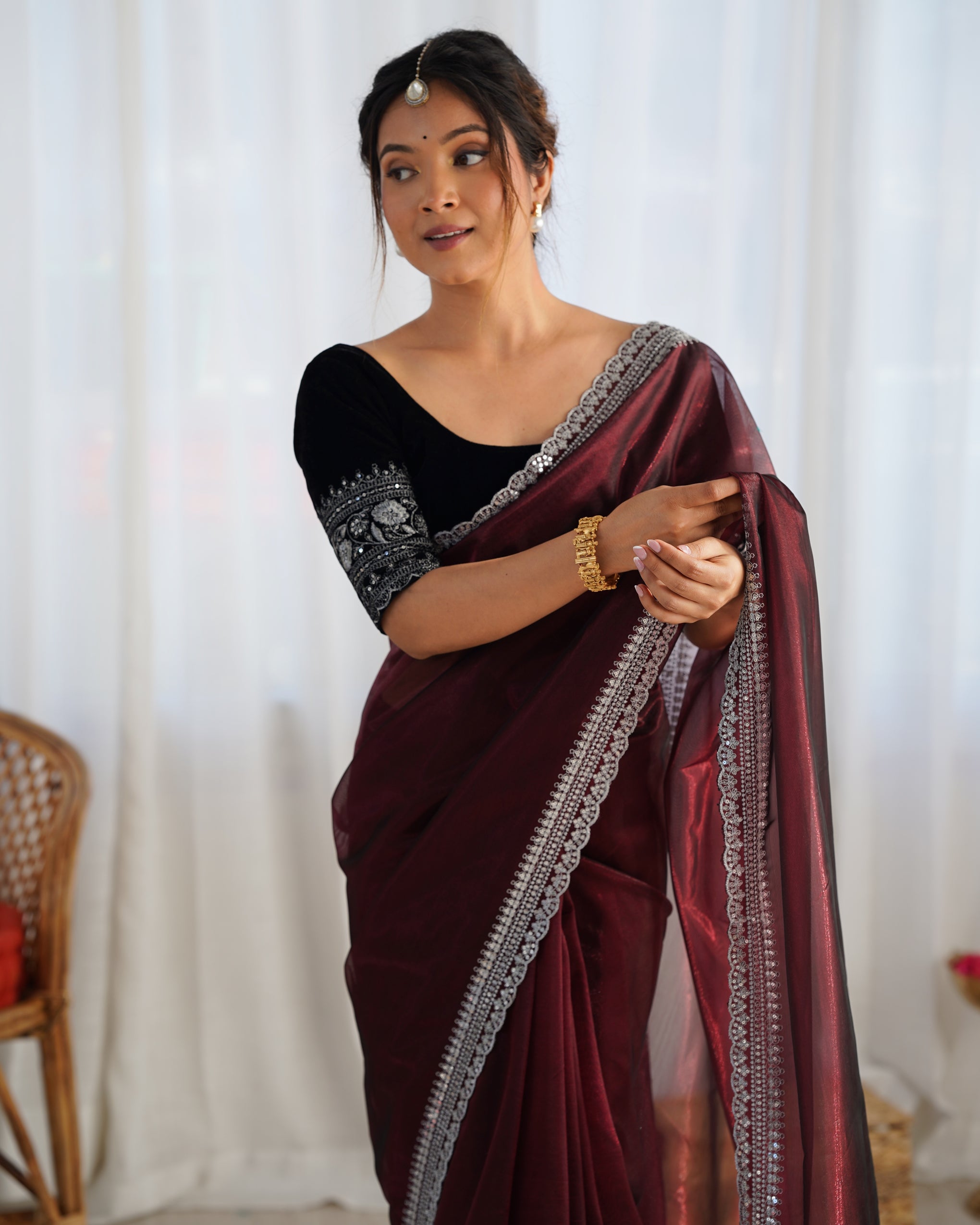 Command attention at every grand event with The Grand Affair Saree. This masterpiece blends the delicate drape of Twill Net with the richness of intricate 3mm Sequin work and shimmering Gold Zari, creating an unforgettable, high-impact look. It’s paired with an ultra-luxurious 9000 Velvet blouse piece, perfect for weddings, receptions, and major festive celebrations.