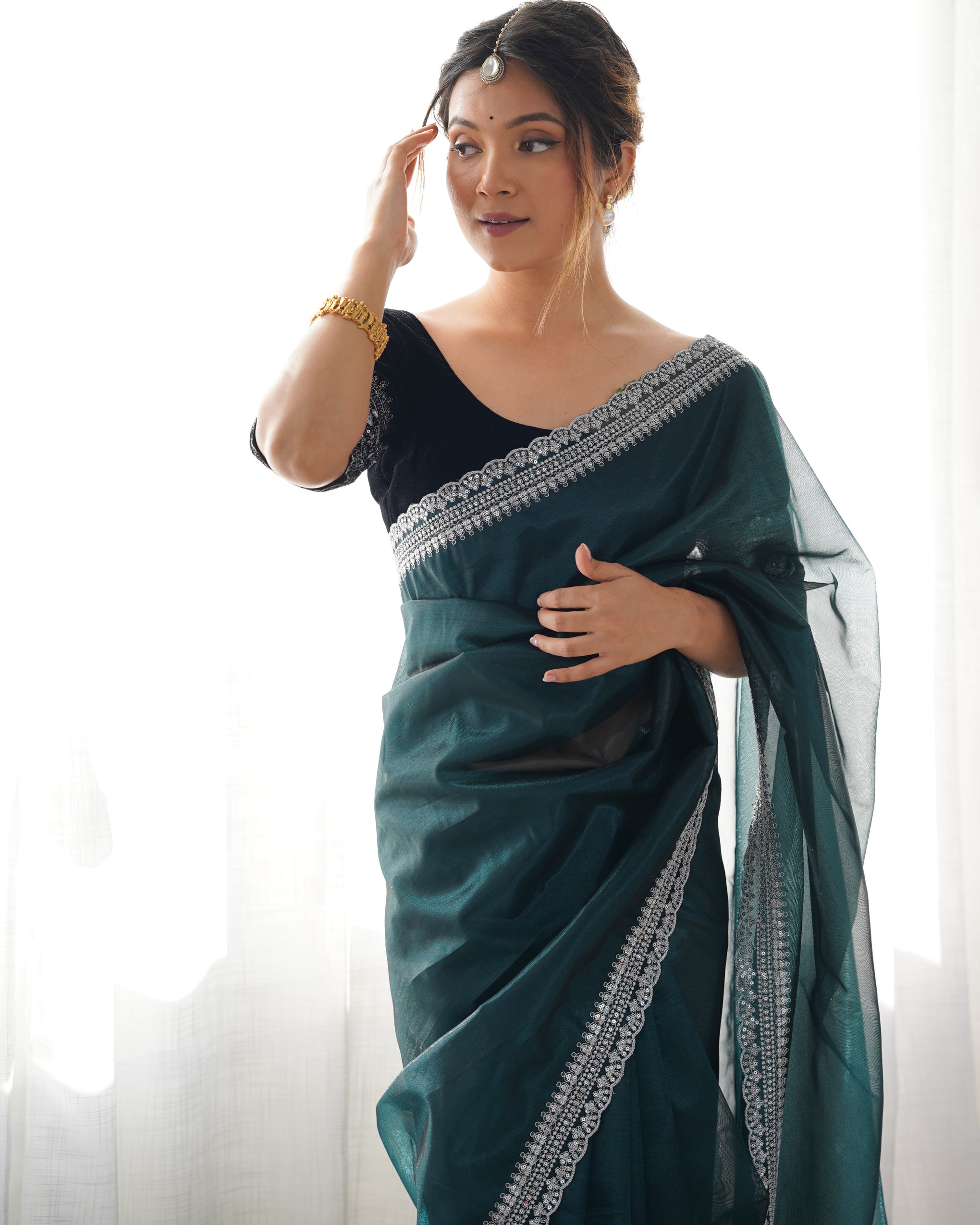 The entire saree is lavished with meticulous 3mm Sequin work interwoven with rich Gold Zari work. This dual-tone hand-embellishment technique creates a dazzling effect that catches the light from every angle, resulting in a dense, opulent pattern that speaks volumes of traditional artistry and modern glamour.